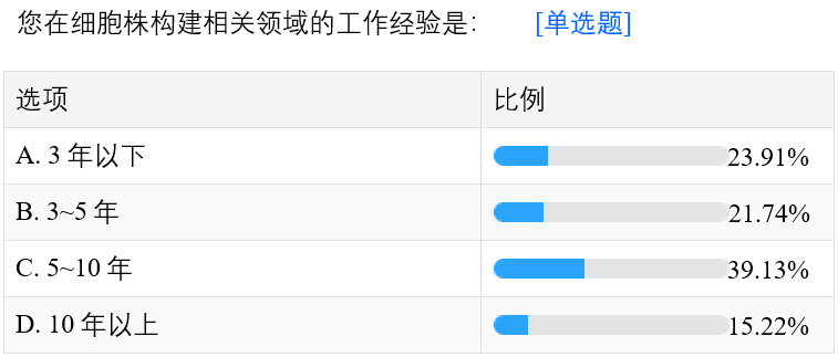 本次调研的受访者均来自细胞株构建相关领域,从业经验分布均衡且覆盖资深群体(5~10 年工作经验者占比最高,达39.13%,3年以上资深从业者合计超76%),调研结果对行业发展具有重要参考价值。我们正式揭晓本次调研的核心数据与深度洞察,愿为业内同仁提供一份兼具参考价值与实践指导意义的行业蓝本,并期待以此次调研为纽带,与行业伙伴凝聚共识、携手协作,加速推动定点整合技术在生物药研发领域的规模化应用,为创新药从实验室走向市场筑牢技术根基,共同为生物药产业高质量发展注入新动能。