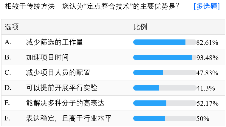 相较于传统方法,定点整合技术的核心优势获得从业者高度共识:93.48%的受访者认可其“加速项目时间”的核心价值,82.61%认为能“减少筛选工作量”,另有52.17%关注其“解决多种分子高表达”的能力。这一结果印证了定点整合技术在破解传统细胞株构建效率低、筛选难等痛点上的关键作用。