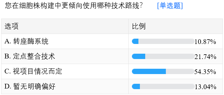 调研显示,97.83%的受访者明确表示愿意将定点整合技术应用于自身项目,仅2.17%持观望态度。在细胞株构建技术路线选择上,54.35%的从业者倾向视项目情况而定,而21.74%明确偏好定点整合技术,反映出行业对该技术的务实认可与应用信心。