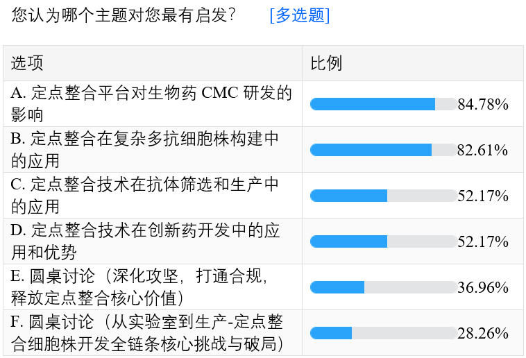 沙龙主题中,“定点整合平台对生物药CMC研发的影响”(84.78%)和“定点整合在复杂多抗细胞株构建中的应用”(82.61%)获得最高关注度,远超其他主题。这表明行业更关注技术在核心应用场景中的落地价值,尤其是在CMC研发合规化和复杂分子构建等关键环节的突破。