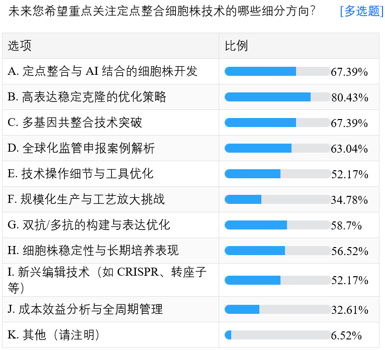 从业者对定点整合技术的未来发展提出了明确期待:“高表达稳定克隆的优化策略”(80.43%)、“定点整合与AI结合的细胞株开发”(67.39%)、“多基因共整合技术突破”(67.39%)成为最受关注的三大细分方向,这也为行业技术创新指明了清晰路径。