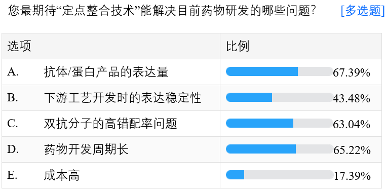 从业者对定点整合技术的未来发展提出了明确期待:“高表达稳定克隆的优化策略”(80.43%)、“定点整合与AI结合的细胞株开发”(67.39%)、“多基因共整合技术突破”(67.39%)成为最受关注的三大细分方向,这也为行业技术创新指明了清晰路径。